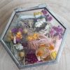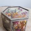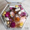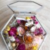 Dit droogbloemen doosje is uniek, er is er maar een van! Het doosje is van glas met zilveren details. Het is gevuld met droogbloemen in roze en gele tinten. Ideaal voor jouw bohemian bruiloft. En het leukste is: na de bruiloft kun je dit glazen doosje een mooi plekje geven in huis, als aandenken aan jullie mooie dag.